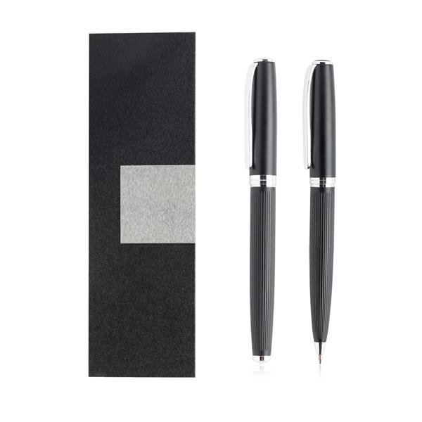 Conjunto de roller e esferográfica em metal, caixa de oferta. Um conjunto de escrita com design moderno, composto por uma esferográfica e uma roller de corpo texturado e uma caixa almofadada com uma chapa exterior, para um ar mais atual. Este conjunto de escrita preta é uma óptima opção de gravação e oferta.