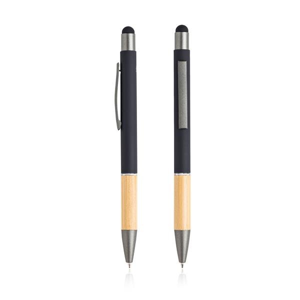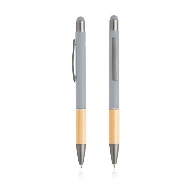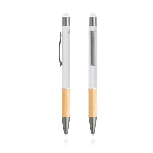 Esferográfica em alumínio reciclado, touch. Feita em alumínio reciclado de desperdício e em fim de vida útil, utilizando processos de rederretimento e aproveitamento e com um grip de bambu. Ao comprar esta esferográfica, está a ajudar a reduzir as libertações de carbono e a reduzir o lixo derivado da não reutilização. Com função touch para usar nos seus dispositivos.
