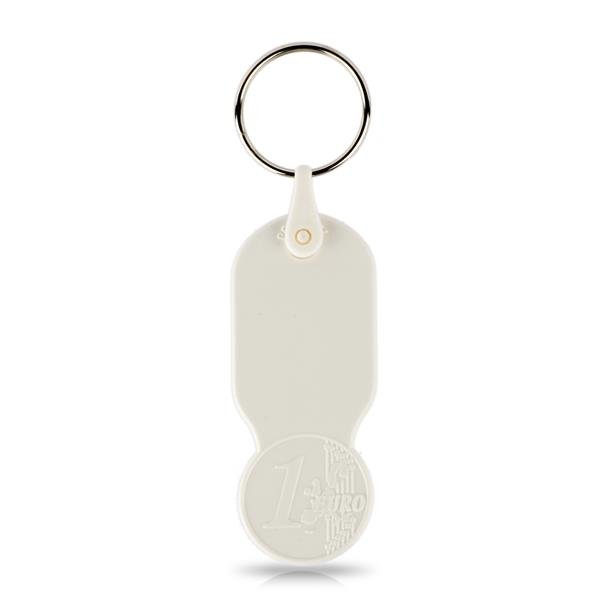 Porta-chaves com ficha 1,00 € para carrinho, plástico PS. Muito útil para compras de supermercado, este brinde tem uma face que pode personalizar com o seu logo.