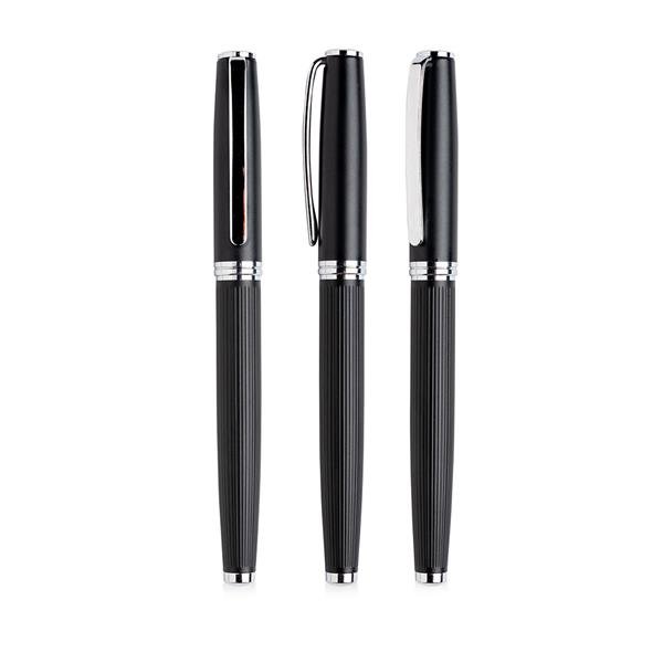 Roller em metal. Roller elegante e sofisticada, com corpo de textura elegante. Sistema de tampa e escrita preta.
